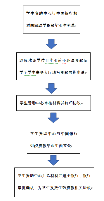 已办理校园地国家助学贷款的同学如需继续攻读学位,并且毕业前不准备偿还贷款,可申请办理贷款展期,贷款展期即将现有贷款办理延期申请,变更还款期限,在继续攻读学位期间贷款利息由国家补贴无需个人承担,待继续攻读学位完成后开始还款。具体办理流程如下: